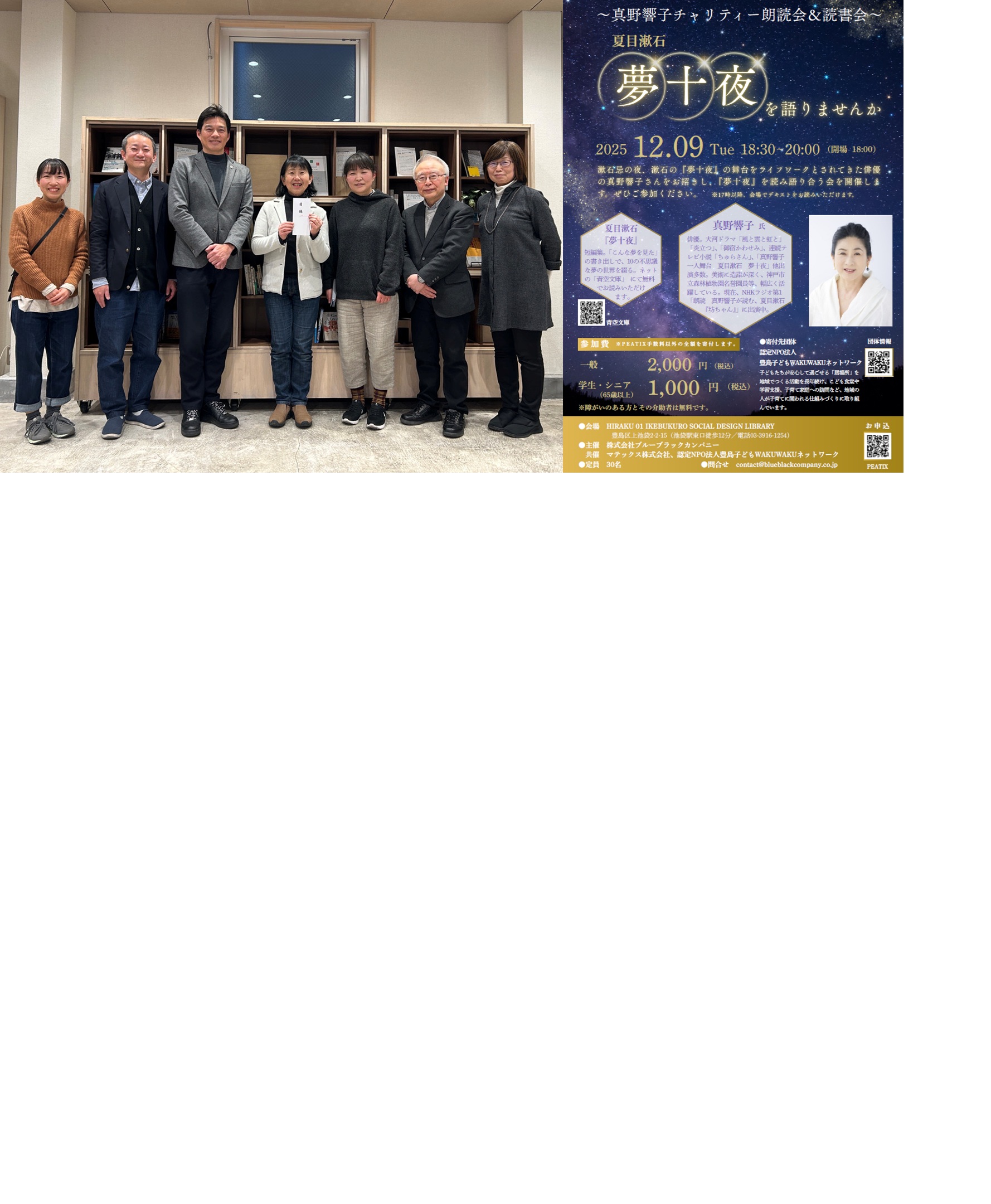 2025年12月9日、HIRAKU 01 IKEBUKUROにおいて開催の「真野響子さんチャリティー朗読会・読書会~夢十夜を語りませんか」(主催:㈱ブルーブラックカンパニー)に、マテックスが共催いたしました。