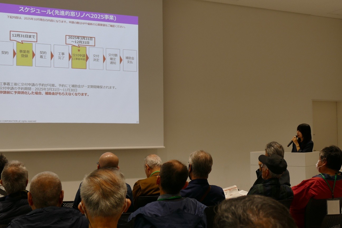以前開催した際、「事業者向けにマンションの窓改修における実務レベルでのノウハウを教えていただきたい」との声があり、今回の相談会ではマンション管理士や工務店などの事業者を対象としたセミナーも新たに開催しました。参加した事業者の方からは「居住者との合意形成や工事における居室の出入りなど、実際の事例をもとに紹介してもらえてとてもわかりやすい内容でした」との声をいただきました。