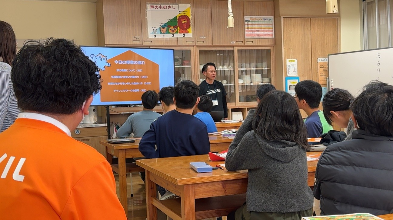 教壇に立ったのはマテックスの社員3名で、1クラス1講師×3クラスで授業を担当、風の通り道や窓の開け方、採光の工夫など身近な住まいの環境を改善するための方法を、ミニワークなどを交えて楽しく学んでもらいました。