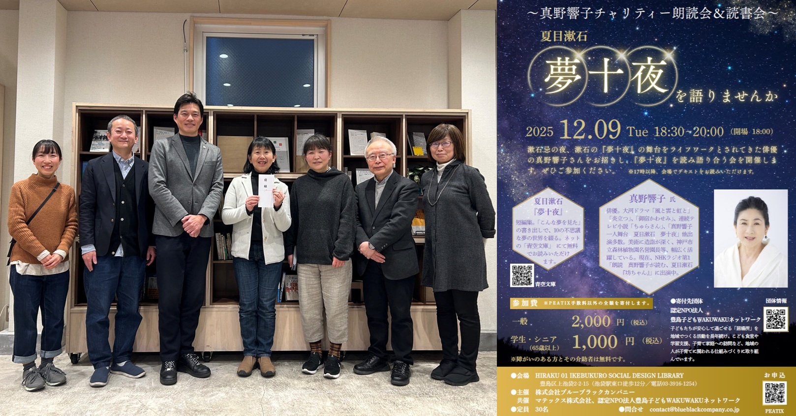 2025年12月9日、HIRAKU 01 IKEBUKUROにおいて開催の「真野響子さんチャリティー朗読会・読書会~夢十夜を語りませんか」(主催:㈱ブルーブラックカンパニー)に、マテックスが共催いたしました。